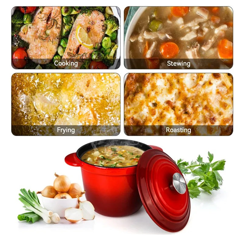 Using high-quality cast iron and a smooth enamel coating, our Dutch Oven helps you cook your meals to perfection by ensuring even heat distribution and easy cleanup. This process ensures delicious, evenly cooked dishes every time, making it perfect for home chefs and cooking enthusiasts.